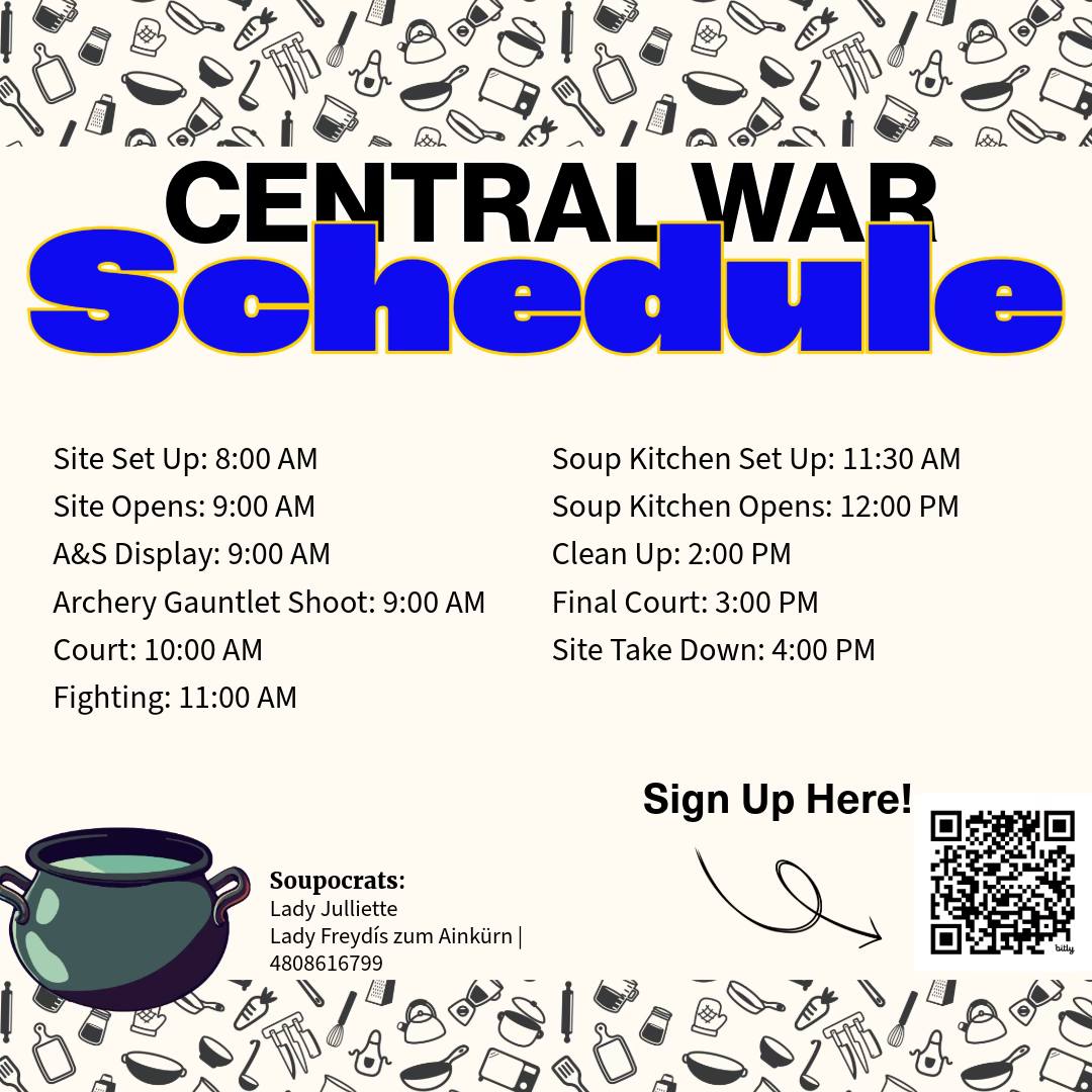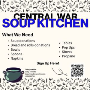The Barony of Twin Moons invites all to gather for Central War Practice, held at the Apache Junction Rodeo Grounds. As the winter winds begin to stir, the distant echo of war drums signals the time to prepare for the battles ahead. This event offers opportunities for fighters and archers alike to hone their skills before war season begins. At the archery range, the Memorial Gauntlet Shoot will take place in honor of those we remember. Heavy fighters can complete their authorizations on site, and there will be heavy melee battles, including combat archery. Rapier fighters will also take to the field in melee scenarios. Between the clashes of steel, attendees are invited to enjoy warm food and fellowship at the Soup Kitchen. Donations of soup, bread, disposable bowls, plastic utensils, and paper towels are appreciated, as are volunteers willing to help serve. Come ready to train, fight, support, and share in the spirit of camaraderie as we prepare together for the coming war.