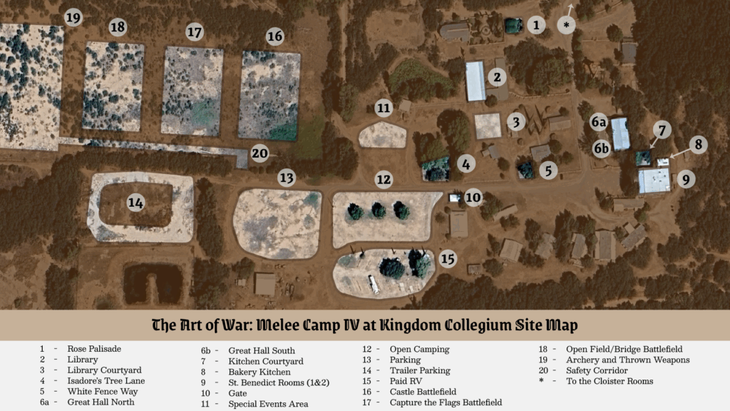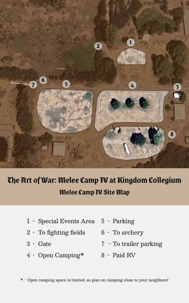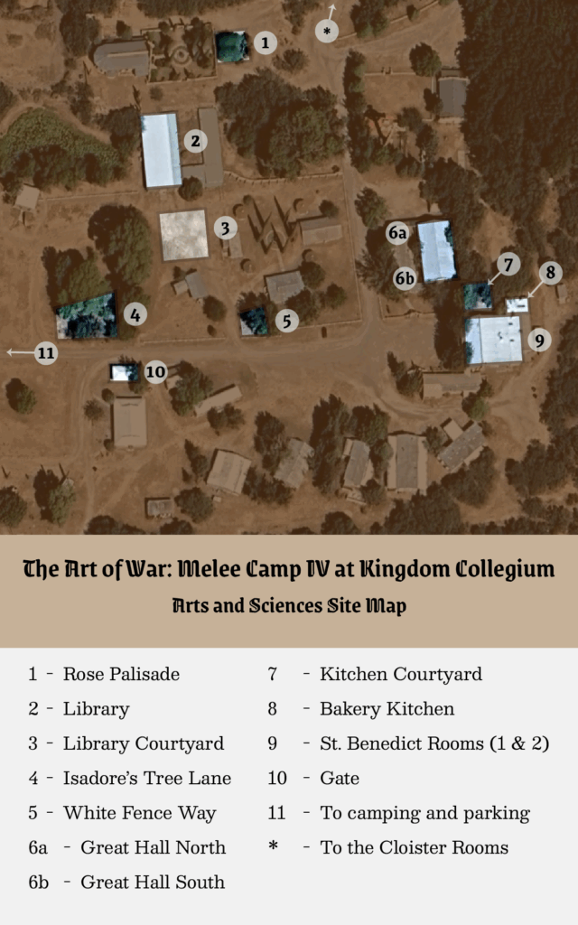 There are three different site maps for this event. There is a full site map formatted for desktop computer screens, as well as Melee Camp IV and Kingdom A&S Collegium maps, each formatted for a phone, for a better mobile experience!