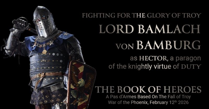 Lord Kal Wirth (Sean) will step on the field of honor, not as a mere mortal, but as Deiphobos reborn; the embodiment of the knightly virtue of bravery. He shall fight for the glory of Troy during the Harnischfechten Deed of Arms – The Book of Heroes at War of the Phoenix!